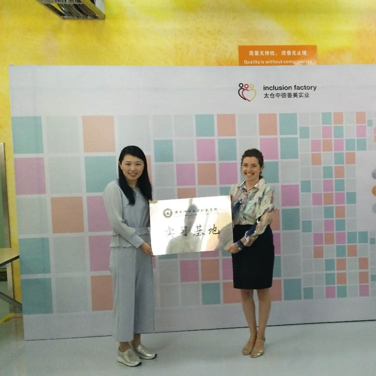 5月10日下午,william威廉英国官网与太仓中德善美实业有限公司在太仓中德善美举行了实习实践基地签约揭牌仪式。william威廉英国官网副经理范莉莉、中德善美企业柯天乐理事长以及william威廉英国官网部分员工和中德善美的员工参加了签约揭牌仪式。范莉莉在讲话中介绍了公司的基本情况,并重点介绍了公司在实习基地方面的建设思路、制度设计和实践成果。中德善美是中国第一家智障人士福利工厂,也是德国企业在华建立的首家残疾人福利工厂。主要借鉴德国奥芬堡的Lebenshilfe模式,对残疾人融合就业开展了本土化的实践,同时对残疾人事业管理的专门人才提出了强烈地需求。双方希望以教学实践基地的建设为契机,培养出高素质的应用型人才,实现双方的互利共赢。
