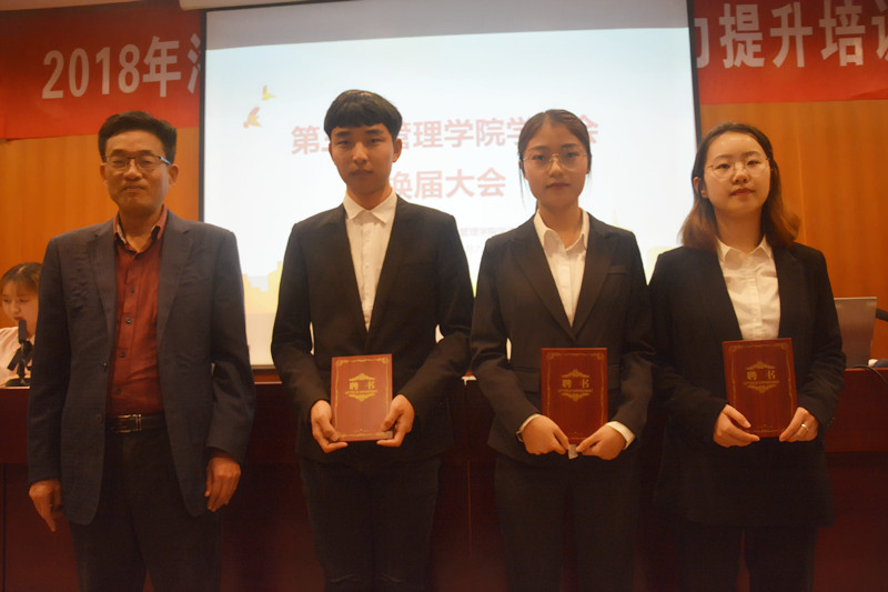 会议开始前夕,全体起立唱团歌,以示庄重严肃。随后,第三届主席团进行了员工会的工作汇报,与会的领导和老师向他们颁发了聘书,并进行了合影留念。继而,团总支书记华娟宣读了关于第四届员工会主席的任职通知,宣布曾李静同学留任员工会主席。进而,曾李静同学做了员工会主席任职工作报告,报告中她展示了自己的个人经历、任职情况及工作计划等,阐述了自己的工作职责,也对今后员工会各部门的工作提出了明确的要求。