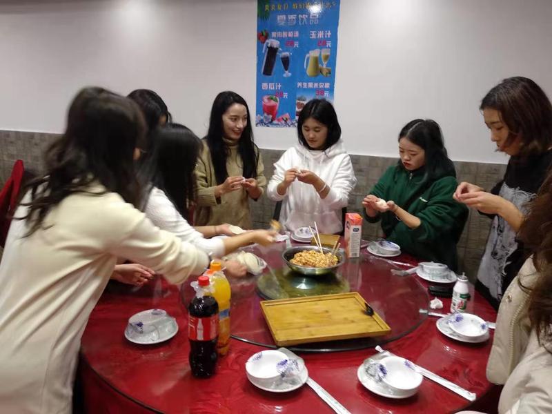 活动下午四点在祥和雅苑吉祥人家举行,同学们围坐在一起,分为四组进行包饺子。劳动的过程中,同学们就和面、擀皮、包饺子,分拆步骤,分工合作。并围绕中国各地包饺子的传统、习俗等话题进行交流。同学们别出心裁地把饺子包成各种形状,有精致小巧的柳叶饺,有个大饱满的东北饺,饺子的摆放也错落有致,很有艺术性,让大家领略了各个地方的不同包饺子风俗。终于在大家的不懈努力下,将一碗碗热气腾腾的饺子呈上餐桌。吃着自己亲手包的香喷喷的饺子,同学们感受节日的快乐和集体生活的温暖。