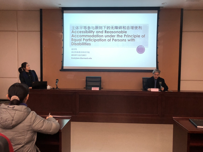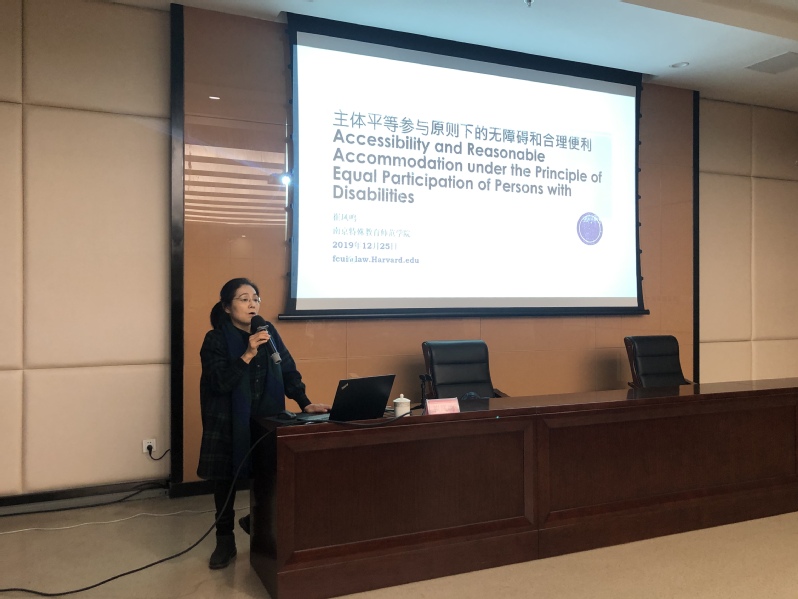 接着,崔凤鸣博士从无障碍的概念阐述开始,从法律视角,围绕主体平等参与下无障碍和合理便利这一主题,从四个方面作了细致阐述:残障概念的认识和界定问题对平等参与带来的影响,基于残障的歧视、合理便利、实质性参与,联合国《残疾人权力公约》对残障群体作为主体的参与的要求,无障碍和合理便利。报告深入浅出、分析透彻。最后,她简要阐释了无障碍和合理便利具体运用时的常见问题,例如,观念性障碍、制度性障碍、缺乏有效的评估机制等,由此深入地阐释了无障碍和合理便利的目的本身是为了充分保障主体平等参与这一理念。讲座鞭辟入里,引人深思。