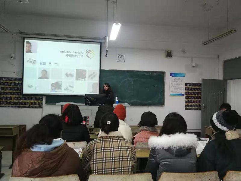 中德善美实业有限公司负责人Lenka老师简单介绍了中的融创工场的基本情况,详细讲解了中德善美的企业文化与内核,传播融合理念和工作内容。已在中德善美担任培训师工作的16级毕业生闫海燕同学以“我与中德善美”为主题,从工作主要内容、公司活动、心得体会向在场同学分享了在中德善美工作的日常点滴,鼓励同学积极踊跃报名。最后Lenka老师就同学们关心的问题进行一一解答,现场氛围融洽。
