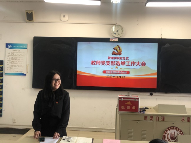 会议开始,常晓茗同志宣读了党支部换届选举程序并代表上届党支部委员会向大会做了工作报告,报告获得全体一致通过。随后,按照会议议程,大会通过了选举办法,通过了监票人和两名计票人提名。根据《中国共产党基层组织选举工作暂行条例》,党支部根据多数党员的意见,经过讨论提名,产生了4名党支部委员候选人,与会党员采用无记名投票的方式进行差额选举,最终选举产生3名新一届党支部委员会委员。三位委员分别作了表态发言,他们对各位党员给予的信任表示感谢,并表示今后将认真履职,努力做好教职工党支部的工作,为广大教职工党员服务。