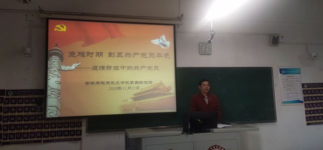 11月11日下午,公司党总支书记李固新在博雅楼2507给全体党员和40名入党积极分子上了一堂以“危难时期,彰显共产党员本色——疫情防控中的共产党员”为主题的精彩生动的党课。
