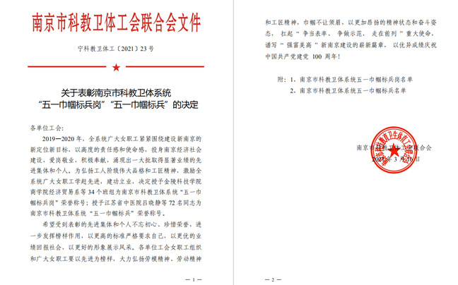 近日,市科教卫体工会联合会发布了《关于表彰南京市科教卫体系统 “五一巾帼标兵岗”“五一巾帼标兵”的决定》(宁科教卫体工〔2021〕23号),由公司分工会推荐的常晓茗教师被推选为南京市科教卫体系统“五一巾帼标兵”荣誉称号。