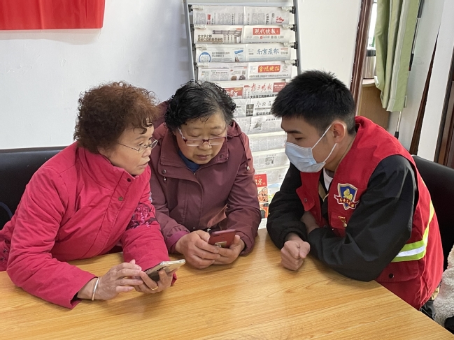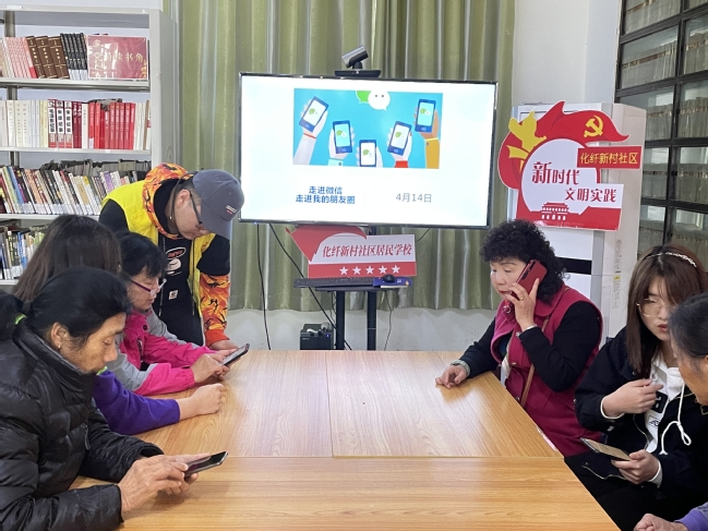 志愿者们沿着小路,慢慢向化纤侨苑前行。走在苍苍梧桐树下,沐浴着悠悠微风,很快就来到了侨苑。进入苑内,鲜艳的玫瑰映入眼帘,一花两色分外妖艳。老人们陆陆续续来到现场,她们彼此打着招呼,笑着入座。等人来齐以后,志愿者们便开始了今天的讲解任务。从“微信”聊天置顶讲到语音转文字,从扫一扫加好友到一键识物,又从共享位置讲到分享名片。爷爷、奶奶们的学习热情很高,他们认真地听着小老师们的讲解。有的爷爷、奶奶视力衰弱,为了更好地看清楚操作过程,眯起眼睛,一点儿都不想错过。志愿者耐心地帮助爷爷、奶奶们进行操作,直到她们都学会,才继续讲解下一个内容。