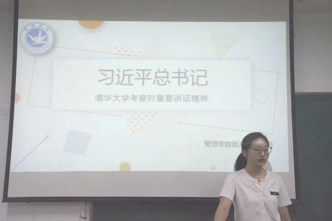 接着丁木含为大家播放了新闻视频,视频中习近平强调广大青年要肩负历史使命,坚定前进信心,立大志、明大德、成大才、担大任,努力成为堪当民族复兴重任的时代新人,让青春在为祖国、为民族、为人民、为人类的不懈奋斗中绽放绚丽之花。