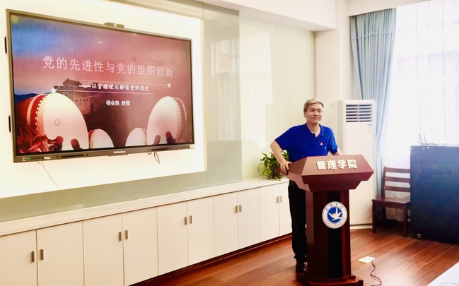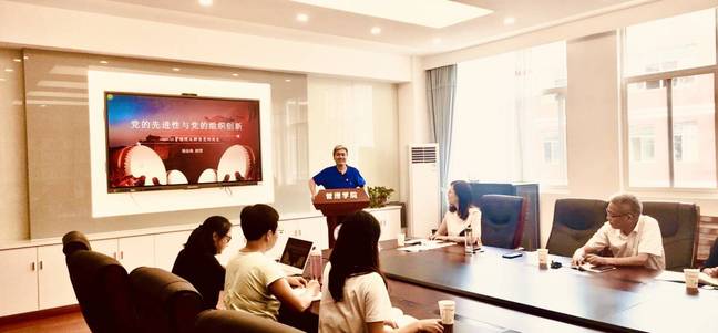 接着,杨会良经理为全体党员讲授党史学习教育的专题党课。杨经理从管理学基本理论出发,以中国共产党从弱小到壮大的发展历程为主线,深入剖析了中国共产党是为何以及如何带领中国人民,从艰难岁月走向全民小康的光辉百年历程,并指出中国共产党的成功源于组织的先进性和组织创新。具体内容有:第一,对中国共产党组织的评价,以五种力量为具体体现,包括注意力、协作力、学习力(经验成本)、治理力(治理机制);第二,中国共产党组织的灵魂,是中国共产党的精神穹宇,包含组织的动机、方式和关系链,也是中国共产党组织的信念力量;第三,中国共产党组织的制度创新,包括把支部建在连上,组织设计的三个基本方面(组织结构、四条原则、内在逻辑)。以上各方面杨会良经理都引用了丰富的党史案例,详实的论据进行了实证论证。讲座既有理论的高度,也有鲜活生动的案例,又有历史的纵深度,使广大党员教师受到了一次别开生面的管理理论视角的党史学习教育。