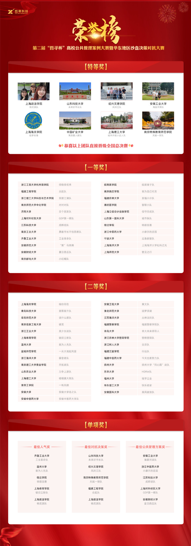 本次大赛是华东地区各高校积极贯彻全国教育大会精神和新时代全国高等公司本科教育工作会议精神的具体行动,是落实立德树人根本任务、加快新文科和国家一流专业建设的重要举措。大赛运用数理模型和数字技术构建案例情景,促进了现代科技与学科知识的深度融合,锻炼了员工们系统思维、学以致用的能力和团队合作精神,得到了众多高校的积极响应并得到参赛者的一致好评。本次参赛一共有58个公司,共60支队伍,面向华东五省一市(上海市、江苏省、浙江省、山东省、安徽省、福建省)的公共管理学科相关本科专业,近300名师生参加了大赛。(彭琳)
