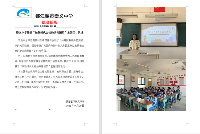 管理1802班预备党员杜文毅选择了自己的母校——都江堰崇义中学开展了一场“特殊”的团课。共青团是党的助手和后备军。杜文毅从历史发展、投身行动、模范人物几个方面向广大共青团员、少先队员宣传爱国主义,鼓励他们从小树立远大理想,成为又红又专、全面发展、德才兼备的社会主义合格建设者和可靠接班人。