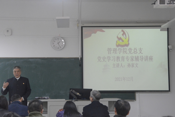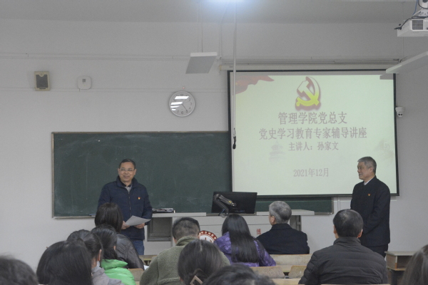 为深入学习贯彻习近平总书记在党史学习教育动员大会上的重要讲话精神,认真落实公司党委关于党史学习教育部署的相关要求,2021年12月1日13:20,管理公司党总支邀请公司孙家文老师在博雅楼2516教室作“从三个《决议》产生的历史背景来深刻理解《决议》的重大历史意义”党史学习教育专家辅导讲座,公司全体师生党员和入党积极分子参加,讲座由公司党总支书记李固新教授主持。