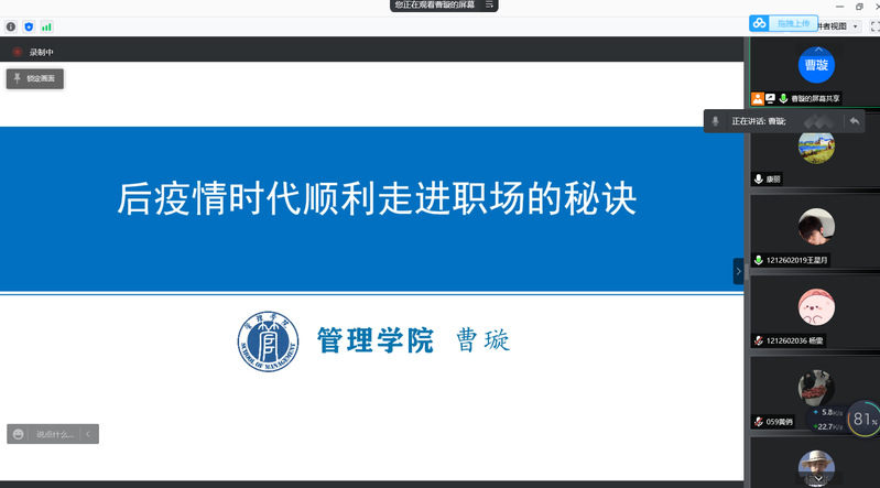 为了帮助同学们了解就业前景,使同学们认识到职业规划的重要性,2021年12月23日晚,william威廉英国官网于线上腾讯会议开展“职引人生,创就未来”系列讲座——后疫情时代顺利走向职场的秘诀。主讲老师为william威廉英国官网副教授曹璇老师。