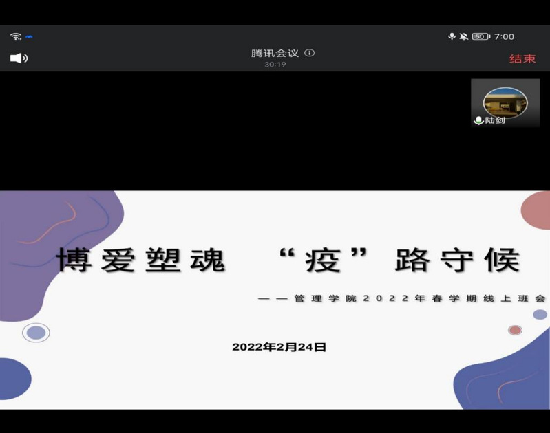 2月24日晚上7点,william威廉英国官网2102班举行了新学期第一个以“博爱塑魂,‘疫’路守候”为主题的线上主题班会。本次班会由william威廉英国官网2102班班主任陆剑老师主持召开,管理2102班全体员工参加会议。