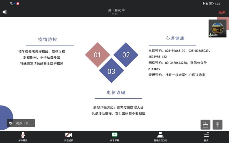 针对近期宿舍走访情况以及线上巡课情况,陆老师对同学们提出三点要求:调整上课状态,不迟到不早退;做好听课笔记,积极互动发言;认真完成作业,纸质稿上传网络。最后,陆老师从做好疫情防控、谨防电信诈骗、保持心理健康等方面指出:在疫情防控的特殊阶段,同学们应按照公司要求做好核酸检测,不得私自外出;在网络上要谨防新型诈骗方式,提高明辨是非的能力;如果遇到心理健康问题要联系公司心理健康咨询室进行预约,及时解决自己的心理问题。