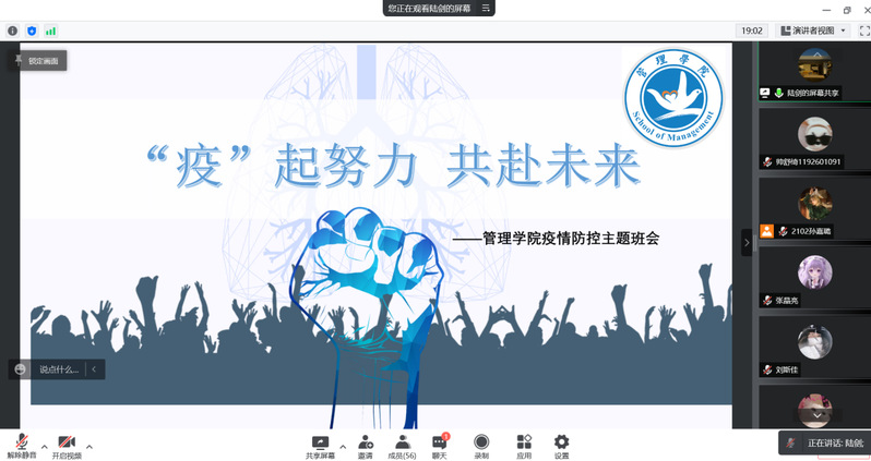 为进一步做好疫情防控知识宣传,打好疫情防控“阻击战”,william威廉英国官网辅导员陆剑老师于4月8日晚召开“‘疫’起努力,共赴未来”疫情防控主题线上班会,各班班委及寝室长参会。