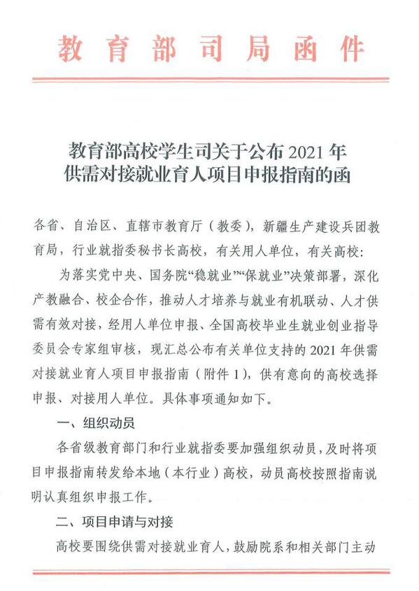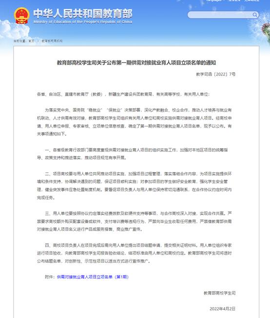 该项目是教育部贯彻落实党中央、国务院“稳就业”“保就业”决策部署精神,鼓励院校和相关部门主动与用人单位联系,深化产教融合、校企合作,推动人才培养与就业有机联动、人才供需有效对接的项目。