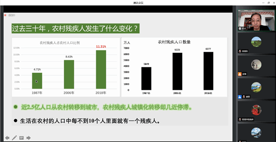 焦若水教授作为从事残疾人事业研究领域的专家,在农村残疾人事业发展方面有非常丰富的经验。焦教授结合近年来对农村残疾人事业的研究,对“中国农村残疾人事业发展”的基本现状和所面临的挑战进行了透彻、细致的分析。焦教授表示,过去的三十年间,有近2.5亿人口从农村转移到城镇,农村残疾人比例也在逐年上升。随之而来的“农村残疾人事业”问题也成了继完成脱贫攻坚任务之后的另一个巨大挑战。虽然农村残疾人贫困问题得到整体解决,但农村残疾人群体脱贫不脱困、返贫风险高、发展的脆弱性难以改变,在共同富裕和乡村振兴战略推进过程中,相对贫困的问题也更加凸显。焦教授也提出了“由问题导向向发展导向转变”、“建立残疾人福利体系”等一系列解决措施,并多次强调“社会对待弱势群体的态度,是判断社会文明程度最直观的体现”。