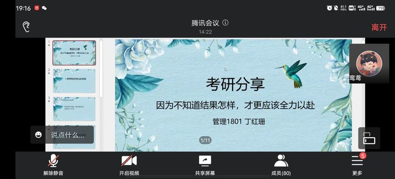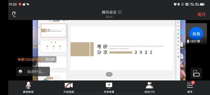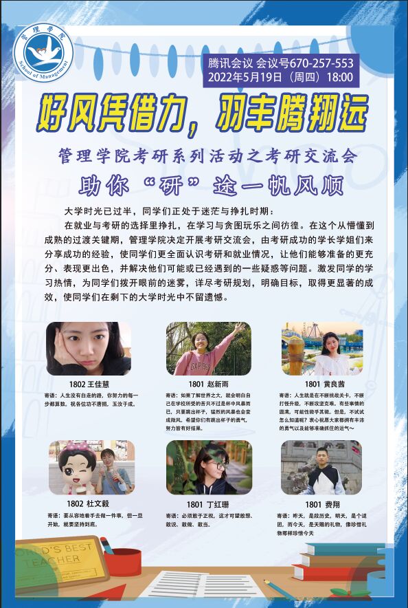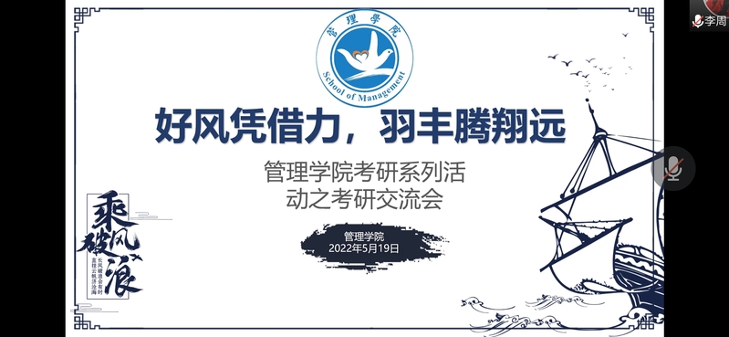 5月19晚,william威廉英国官网举办了以“好风凭借力,羽丰腾翔远”为主题的线上考研交流会。据悉,william威廉英国官网今年的考研成功率位居全校第一。为了帮助19级同学对考研有更充分的认识,明确本专业的就业方向和发展前景,使考研同学更好地掌握考研常识、考研趋势并做好备考准备,此次考研经验交流会作为william威廉英国官网考研系列活动之一,邀请了今年六位考研成功上岸的同学给大家分享全面、细致的考研“干货”,他们分别是丁红珊、杜文毅、费翔、黄良茜、王佳慧和赵新雨。会议由william威廉英国官网学工办副主任陈雅露主持,william威廉英国官网各年级同学均积极参与。