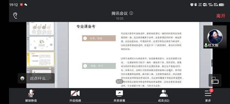 最后,陈雅露老师做总结,强调了以下四点:第一,背书是王道。背书不是死记硬背,需要寻找适合自己的记忆方法;第二,把厚书背薄,把薄书背厚。利用思维导图把书本的框架知识点一一罗列,再根据知识框架背诵填充;第三,广泛涉猎,紧跟时事。要多看专业相关公众号,推荐碎片化阅读,记下要点;第四,多动笔,多模拟。在知识点基本掌握后,多做真题和模拟考试题,多写多练,多实践。