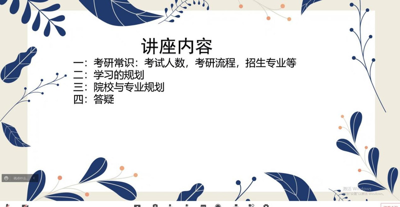 陆老师从考研常识开始介绍,主要包括考试人数、考研流程、招生专业等方面。陆老师针对学硕与专硕的种类进行了介绍,随后详细地介绍了初试考试科目与时间和不同专业需要考核的科目与大致分数线。陆老师建议考研同学一志愿成功,尽量不调剂。其中着重介绍了政治考试科目及所占比例、英语试卷题型、题量与分值、数学分类及试卷结构。随后陆老师对院校与专业规划进行讲解,结合招生简章对具体高校的不同专业需要考核的科目再次进行详细的解读,对于跨专业的考研情况结合往年案例进行了难度分析。