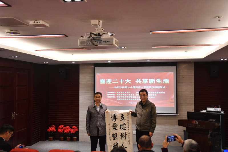 恰逢公司成立40周年之际,任金宝副理事长代表南京市盲人协会向公司捐赠了由残疾人书法家创作的书法作品“博爱塑魂 立德树人”,表达了对南京特师建校40周年的祝福。