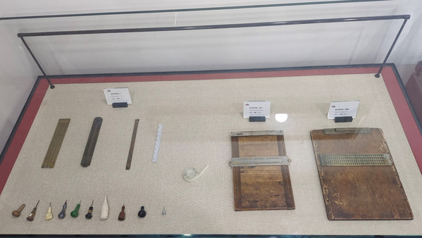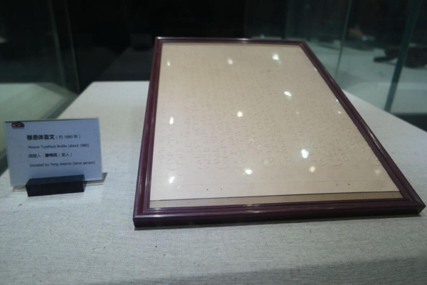 紧接着,我看到了中国特殊教育博物馆的镇馆之宝——穆恩体盲文,它在一个并不起眼的角落,后来经过了解才知道,它虽然发明时间早,但却没有被广泛使用,因为它学习门槛高,难记难摸。说它是镇馆之宝是因为穆恩体盲文在中国大陆仅存6页,而中国特殊教育博物馆收藏的这是第三页。这种盲文主要由一些圆圈、折线、点组成,形体上只部分保留了罗马字母的轮廓,以最简单的线条来表示文字,字体上都是凸起的线条形式,看上去像一种简单的线条。
