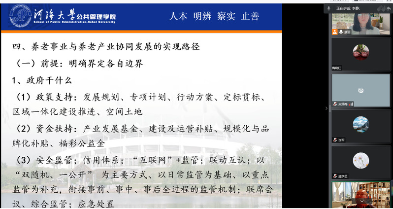 李静教授简介:河海大学老年保障研究所所长、教授、博士生导师,南京大学管理学博士、社会学博士后。江苏省高校“青蓝工程”中青年学术带头人、江苏省社科优青,江苏省级一流本科课程《社会救助》(民政部民政系统优秀网络课程资源)负责人。研究方向:养老服务、社会救助、社会治理。主持国家级、省部级纵向科研项目及横向项目四十余项,在《中国行政管理》等期刊上公开发表学术论文六十余篇,出版专著5部,译著4部;相关政策建议多次获得省领导批示。主要社会兼职:民政部社会事务工作专家委员会成员、中国残疾人事业发展研究会残疾人社会工作专委会副主任委员、中国社会保障学会养老服务分会常务理事、中国老年学和老年医学学会青年委员会副主任委员、中国老年学和老年医学学会志愿与公益分会常务理事、江苏省老年学学会常务理事及青年委员会主任、中国盘古智库特约研究员、云南省高等公司公共管理类专业教学指导委员会委员等。(文、图/邹文文、杨子晔 审核/康丽)