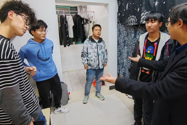 卢书记依次走访了所有的新生宿舍,了解新生住宿环境以及宿舍各种设备,确保新生住的安心、住的舒适,能够适应校园的住宿生活,开启他们的校园之旅。卢书记也专门走访了在本次新生宿舍中优秀获奖的宿舍,并号召其他宿舍向获奖宿舍学习,营造良好的宿舍风貌。卢书记在走访宿舍中给新生们提出了几点希望:第一,在大学里要努力认真的学习,打好基础;第二,要把握好课余空闲时间,积极参与实践活动,做一个全面发展的人;第三,互相监督式学习,共同创造良好的宿舍氛围,争取营造“书香”宿舍;第四,要做一个阳光自信的人,相信经过大学的历练,会有更加出彩的人生。