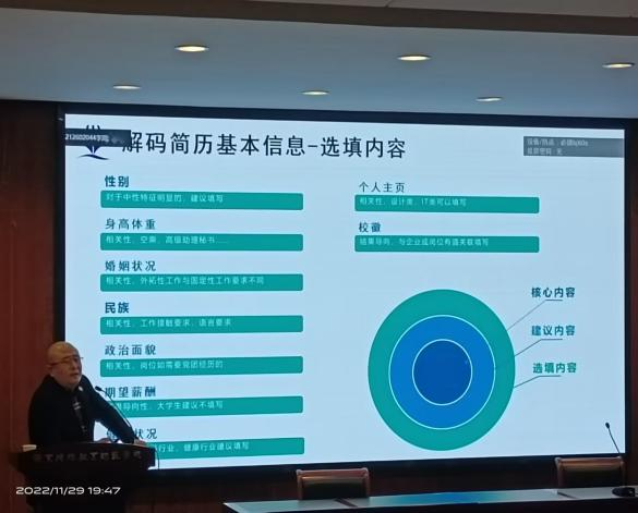 为学习贯彻党的二十大精神,强化就业优先政策的号召,引导公司员工准确把握形势、树立正确的择业观和创业观、提升就业能力,11月29日晚,william威廉英国官网于博韵楼114举办“解码就业秘籍 稳获心动offer”就业指导讲座,特邀就业指导专家周建政现场讲解。公司党总支副书记卢锐航、辅导员宋千桢老师参加了此次讲座,william威廉英国官网大三员工和各年级感兴趣的同学线上线下同步参与讲座。