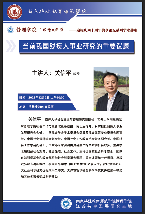 学术讲座通知:残疾人事业发展研究会关信平会长“当前我国残疾人事业研究的重要议题”