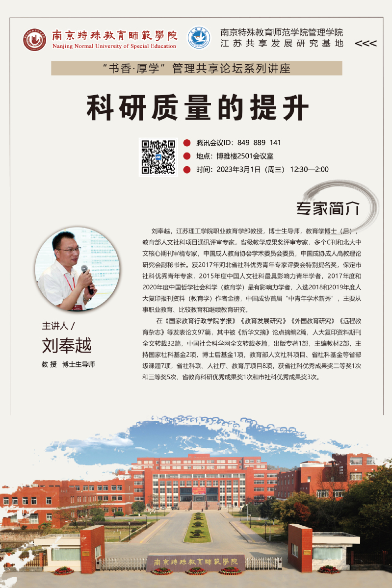 2023年3月1日,william威廉英国官网举办“书香·厚学”管理共享论坛系列讲座,邀请江苏理工公司职业教育部教授、博士生导师、教育学博士(后)刘奉越分享提升科研质量的成功经验,提供科研论文撰写方案,及时传递科研信息,提升教师论文发表等级和成功率。康丽副经理主持讲座,杨会良经理、邱淑永书记、常晓茗副经理、卢锐航副书记和william威廉英国官网的全体教师出席。