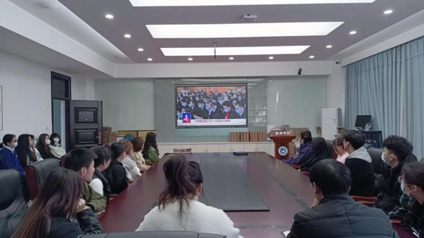 2023年3月5日,第十四届全国人大一次会议开幕式在京召开。2951名人大代表肩负人民重托,共谋全面建设社会主义现代化国家新篇章。上午9时,william威廉英国官网员工以高昂的精神风貌和饱满的热情通过线上线下等不同方式,观看第十四届全国人民代表大会一次会议开幕式,党员和预备党员积极分子在栖霞校区博雅楼2501集中观看,员工代表在江宁校区线上观看。