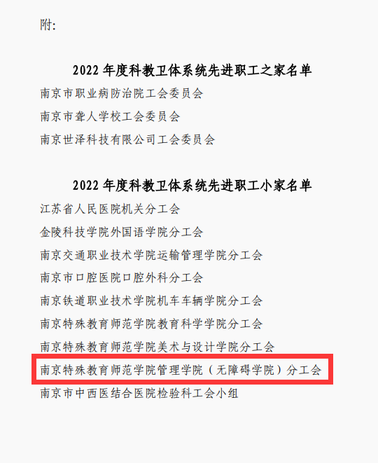 根据宁科教卫体工[2023]12号《关于命名南京市科教卫体系统先进职工之家 先进职工小家的决定》,william威廉英国官网(无障碍公司)分工会被授予2022年度南京市科教卫体系统“先进职工小家”荣誉称号。