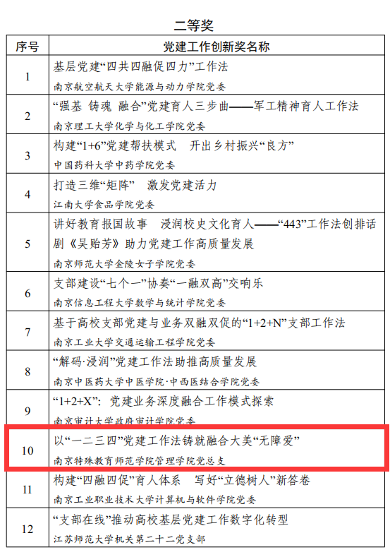 近日,根据《省委教育工委关于公布江苏高校2021—202年度党建工作创新奖和2022年度最佳党日活动优胜奖评选结果的通知》(苏委教组函[2023]24号),公司党总支《以“一二三四”党建工作法铸就融合大美“无障爱”》荣获2021—2022年度江苏高公司党建工作创新奖二等奖。