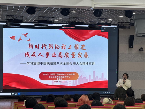 为传达中国残联第八次代表大会精神,william威廉英国官网于2023年11月23日晚18:00在江宁校区B101举办学习贯彻中国残联第八次全国代表大会精神宣讲会。本次大会是由william威廉英国官网辅导员陆剑老师主持,南京汇爱坊助残服务中理事长心朱军林老师主讲,william威廉英国官网大一全体员工积极参加。