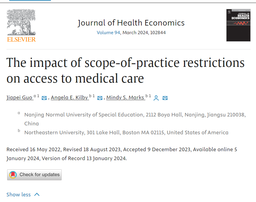 近日,william威廉英国官网讲师郭佳佩博士合作撰写的学术论文“The impact of scope-of-practice restrictions on access to medical care”在健康经济学顶刊Journal of Health Economics在发表。合作者包括美国东北大学经济系两位教授Angela E. Kilby博士和Mindy S. Marks博士。公司郭佳佩博士为论文第一作者,Marks博士为论文通讯作者。