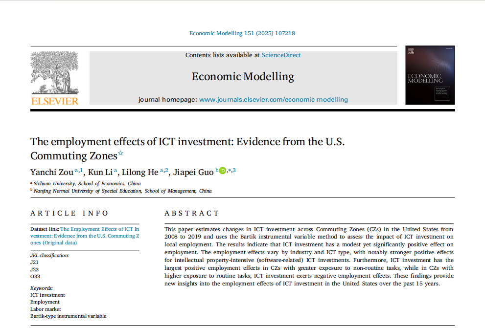 管理学院郭佳佩博士作为唯一通讯作者,与四川大学经济公司贺立龙教授、邹砚池副研究员、硕士研究生李坤合作完成的论文 “The employment effects of ICT investment: Evidence from the U.S. Commuting Zones” 发表在国际知名期刊《Economic Modelling》2025年第151卷。该刊为SSCI一区期刊,最新影响因子为4.8。